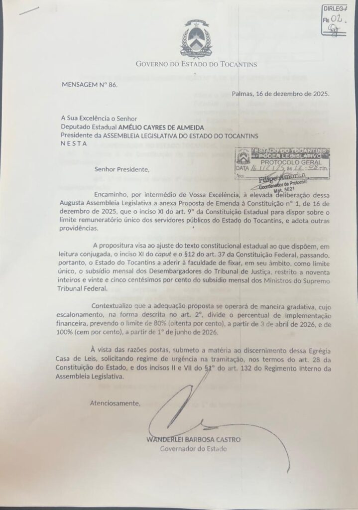 Mensagem do Governador Wanderlei Barbosa acerca da PEC do Subteto, enviada à Aleto