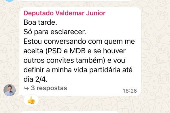 Em mensagem enviada a um grupo de WhatsApp, Valdemar afirmou que está conversando com MDB e PSD, além de avaliar outros convites, e que deve definir seu destino partidário até o próximo dia 2 de abril. “Estou conversando com quem me aceitar (PSD e MDB e se houver outros convites também) e vou definir minha vida partidária até o dia 2/4”, afirmou. De fato, tanto Valdemar quanto Olyntho passaram pelo encontro do PSD, dia 25, em Palmas.