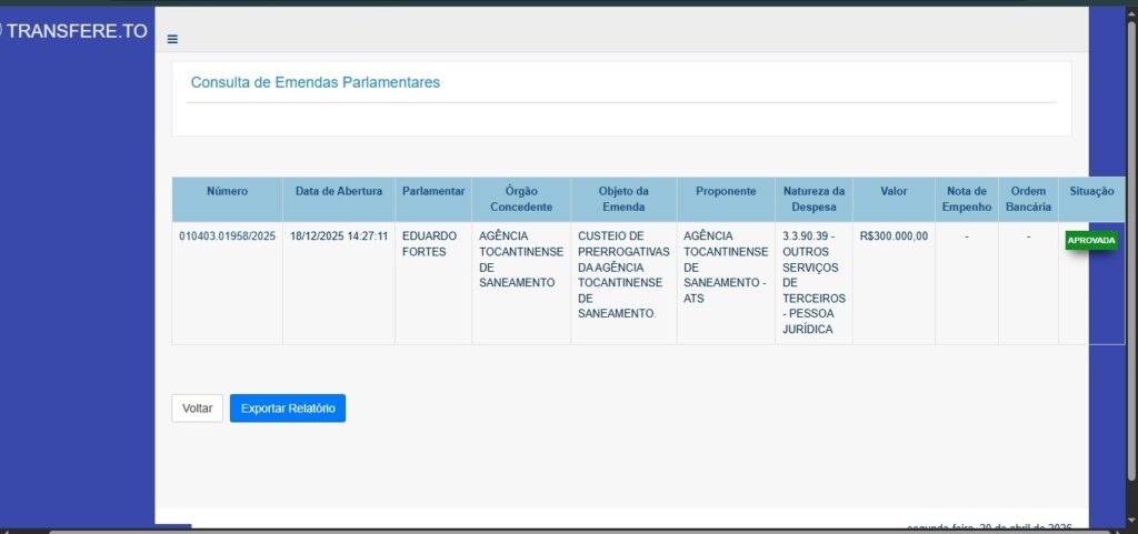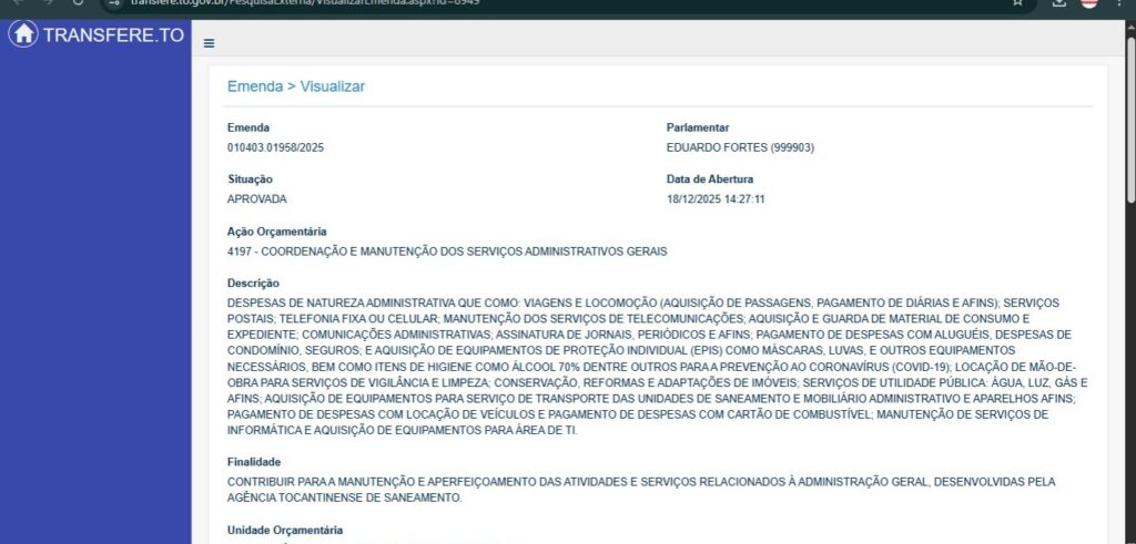 No entanto, dados levantados pela reportagem no sistema estadual de acompanhamento de emendas indicam outra classificação para o recurso. O cadastro da emenda 010403.01958/2025 aponta como objeto “custeio de prerrogativas da Agência Tocantinense de Saneamento”, dentro de uma ação orçamentária voltada à manutenção administrativa do órgão, incluindo despesas como serviços, locações, combustível, telecomunicações e apoio operacional.