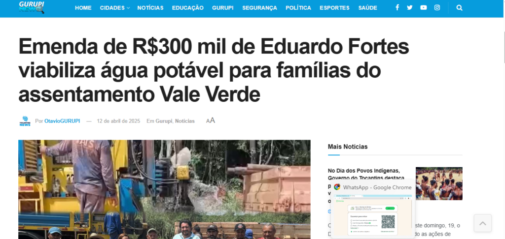 A linha de investigação contrasta com a divulgação feita pelo próprio parlamentar. Em abril de 2025, Eduardo Fortes afirmou que havia destinado R$ 300 mil à ATS para viabilizar a perfuração dos poços e garantir abastecimento de água a famílias do assentamento. À época, ele também acompanhou a execução da obra e declarou que a iniciativa atendia a uma demanda antiga da comunidade.