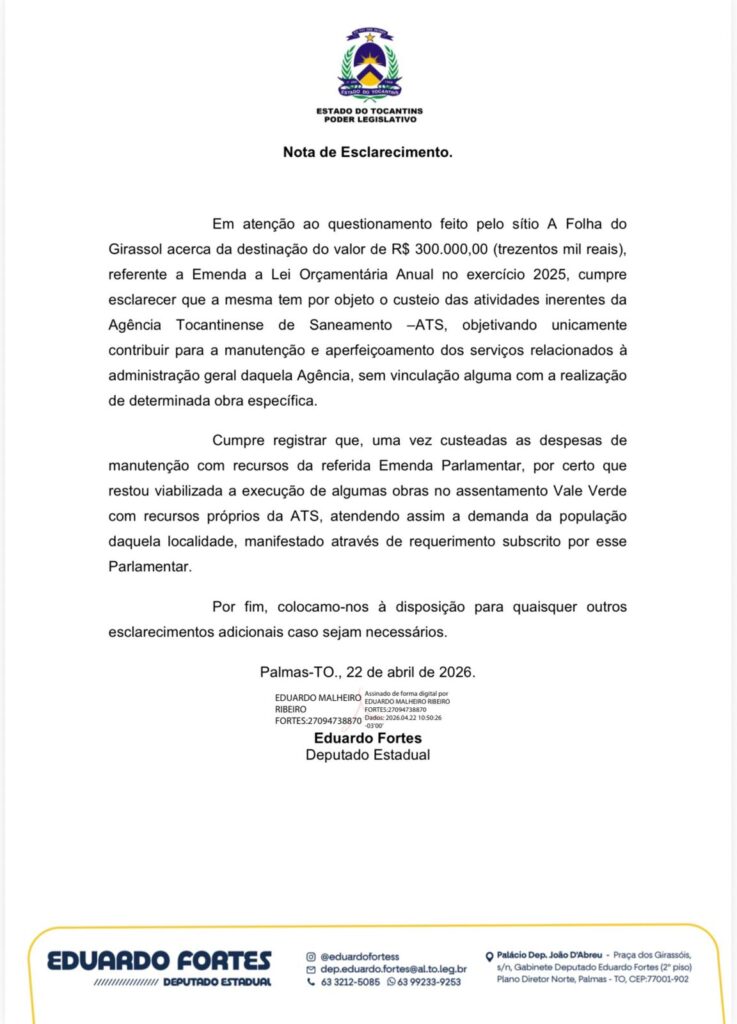 A Folha do Girassol entrou em contato com a assessoria do deputado Eduardo Fortes. Em nota, o deputado afirmou que a emenda teve como objetivo exclusivo o custeio das atividades da Agência Tocantinense de Saneamento, sem vinculação direta com obra específica.